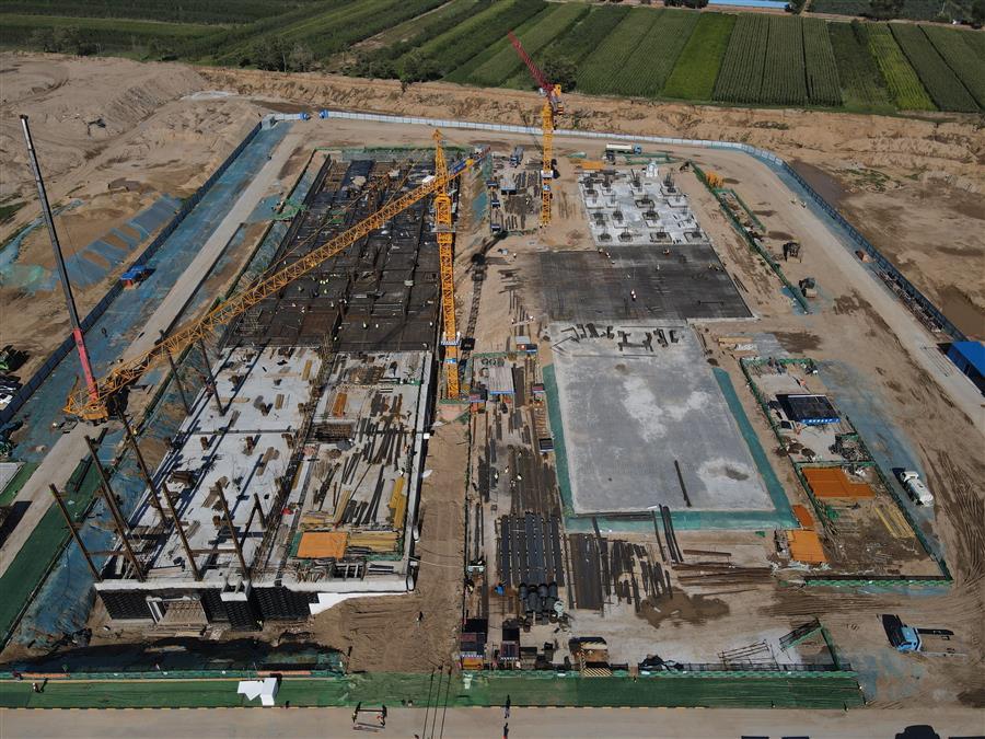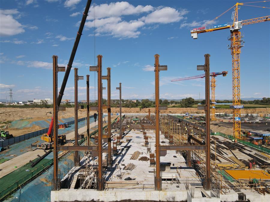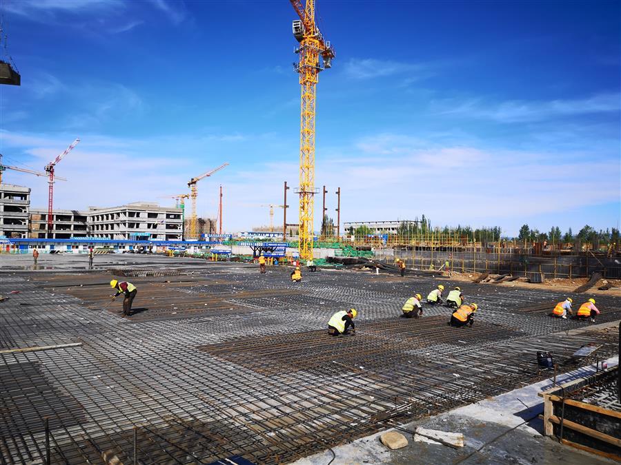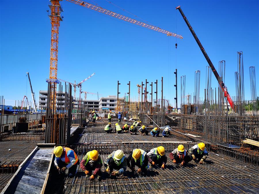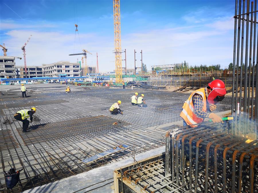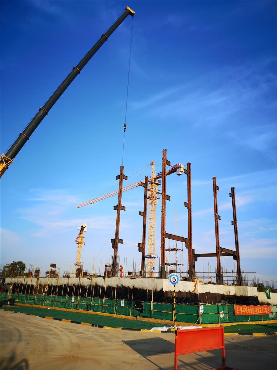目前,項目正在進行主體施工,施工現(xiàn)場正緊張有序地進行著模板安裝、鋼筋綁扎、水電管線預(yù)埋、鋼結(jié)構(gòu)吊裝等工作。