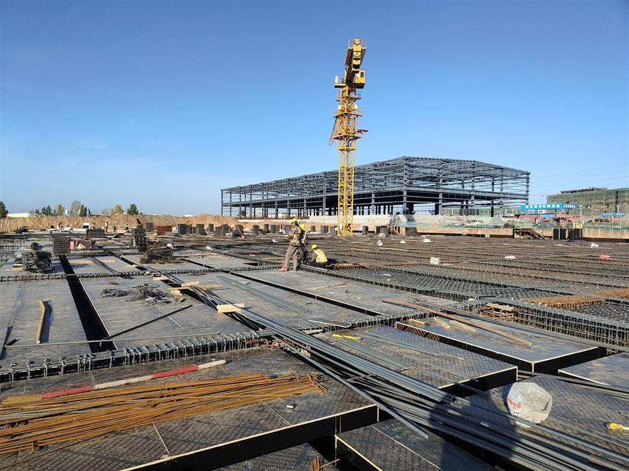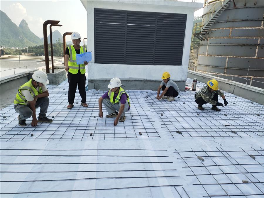 融安縣生活垃圾焚燒發(fā)電項目工程總承包項目,工人正在進(jìn)行汽機間屋面鋼筋網(wǎng)綁扎。