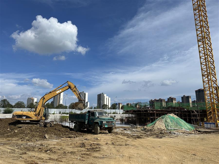 在農(nóng)投思賢幸福加項目,技術(shù)人員測繪、工人在綁扎鋼筋各作業(yè)面工作人員緊張忙碌地開展工作;施工機(jī)械運(yùn)轉(zhuǎn)不停、運(yùn)輸車輛來回穿梭,一派繁忙景象。