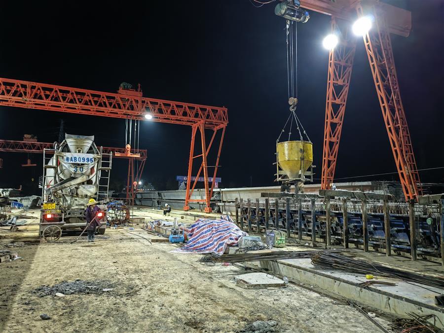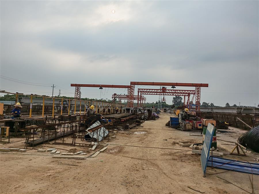在施工現(xiàn)場,20多臺大型設(shè)備在不同時段連續(xù)配合作業(yè),運輸車輛有序進行運土填筑路基、材料進出場,100多名項目管理人員及工人分為預(yù)制梁場、樁基施工、橋梁下部結(jié)構(gòu)等班組全線鋪開,在各個作業(yè)點上有條不紊地開展施工作業(yè)。