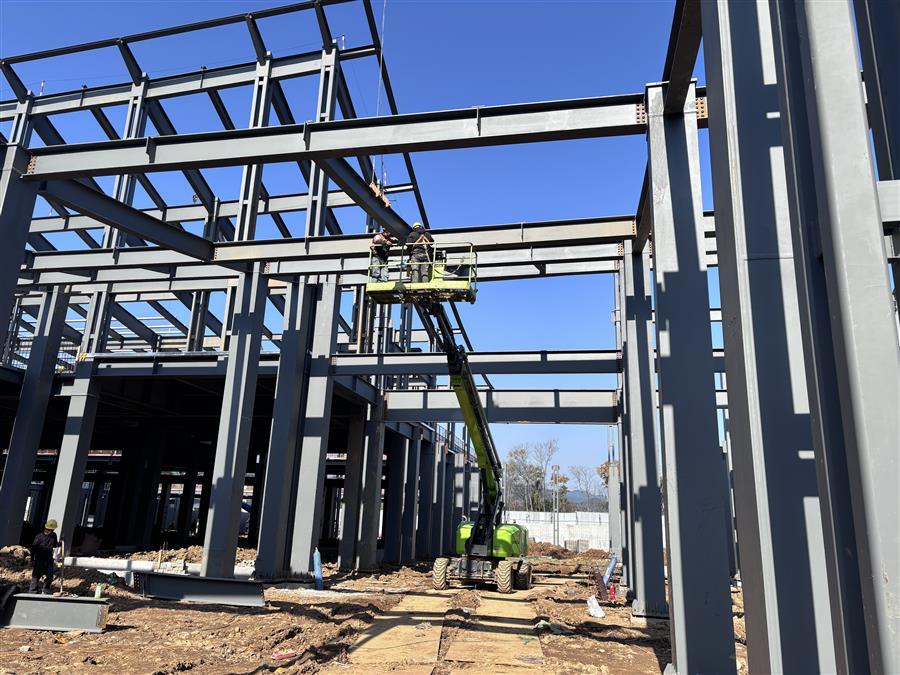 項目施工現(xiàn)場,機器轟鳴,工程車輛來回穿梭,工人們在各點位開展墊層、樓承板澆筑、鋼筋綁扎、栓釘焊接、基礎(chǔ)砌磚、屋面底板和鋼結(jié)構(gòu)梁柱安裝等施工作業(yè),處處涌現(xiàn)“冬忙”景象。