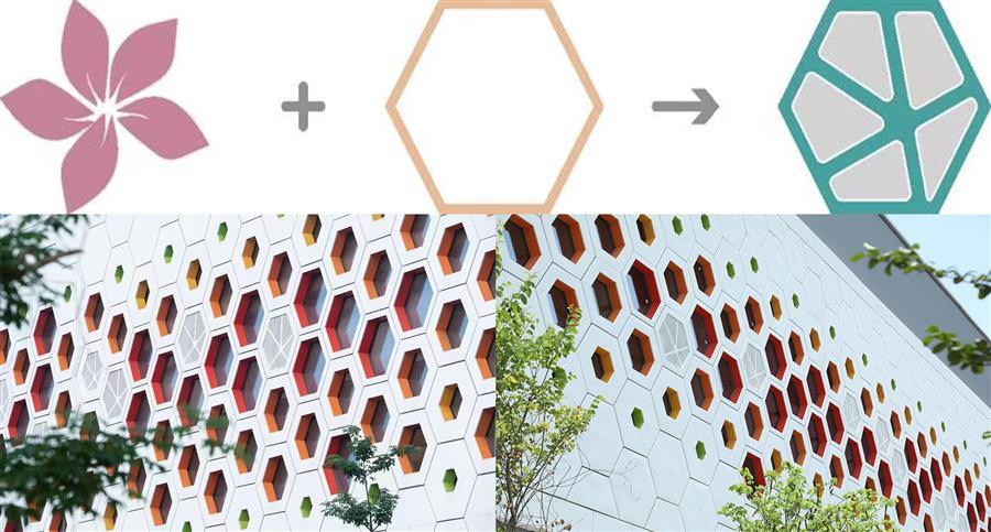 項(xiàng)目整體采用去工業(yè)化設(shè)計(jì),將紫荊花與蜂巢的意象同時(shí)融入建筑立面,形成“蜂棲紫荊”的寓意;其中紫荊花代表柳州,而蜂巢之中花粉釀蜜的過(guò)程,又與垃圾焚燒發(fā)電的工藝流程形成隱喻。