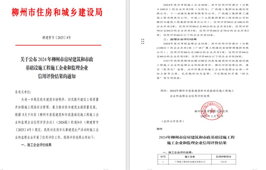 近日,柳州市住房和城鄉(xiāng)建設(shè)局發(fā)布《關(guān)于公布2024年柳州市房屋建筑和市政基礎(chǔ)設(shè)施工程施工企業(yè)和監(jiān)理企業(yè)信用評(píng)價(jià)結(jié)果的通知》(柳建管字〔2025〕8號(hào)),冶建公司以122.18分的優(yōu)異成績(jī),位列柳州市施工企業(yè)信用評(píng)價(jià)榜首,彰顯了公司在工程質(zhì)量、安全管理及市場(chǎng)信譽(yù)等方面的卓越實(shí)力。