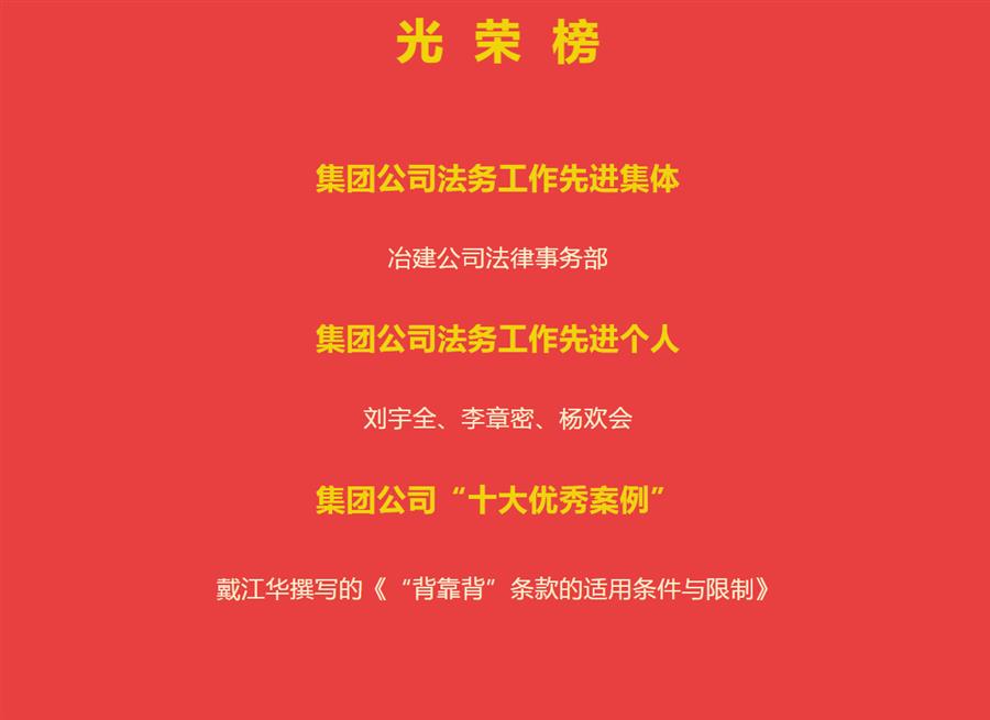 這些榮譽(yù)的取得,是全體法務(wù)人員辛勤努力的結(jié)果,更是公司整體實(shí)力的體現(xiàn)。冶建公司法律事務(wù)部將繼續(xù)為公司平穩(wěn)發(fā)展拼搏奮進(jìn),努力為公司實(shí)現(xiàn)恢復(fù)性增長作出新的貢獻(xiàn)!
