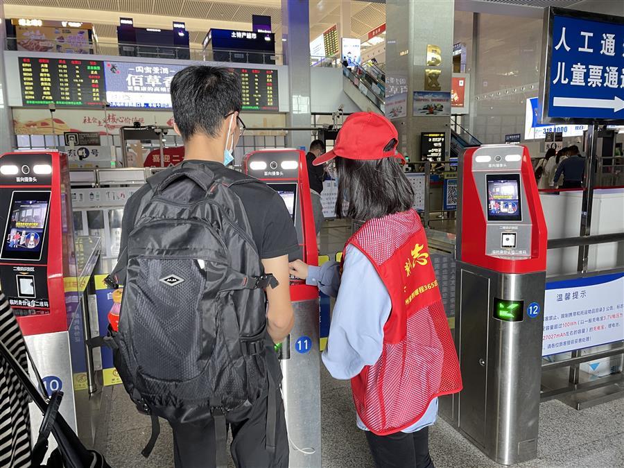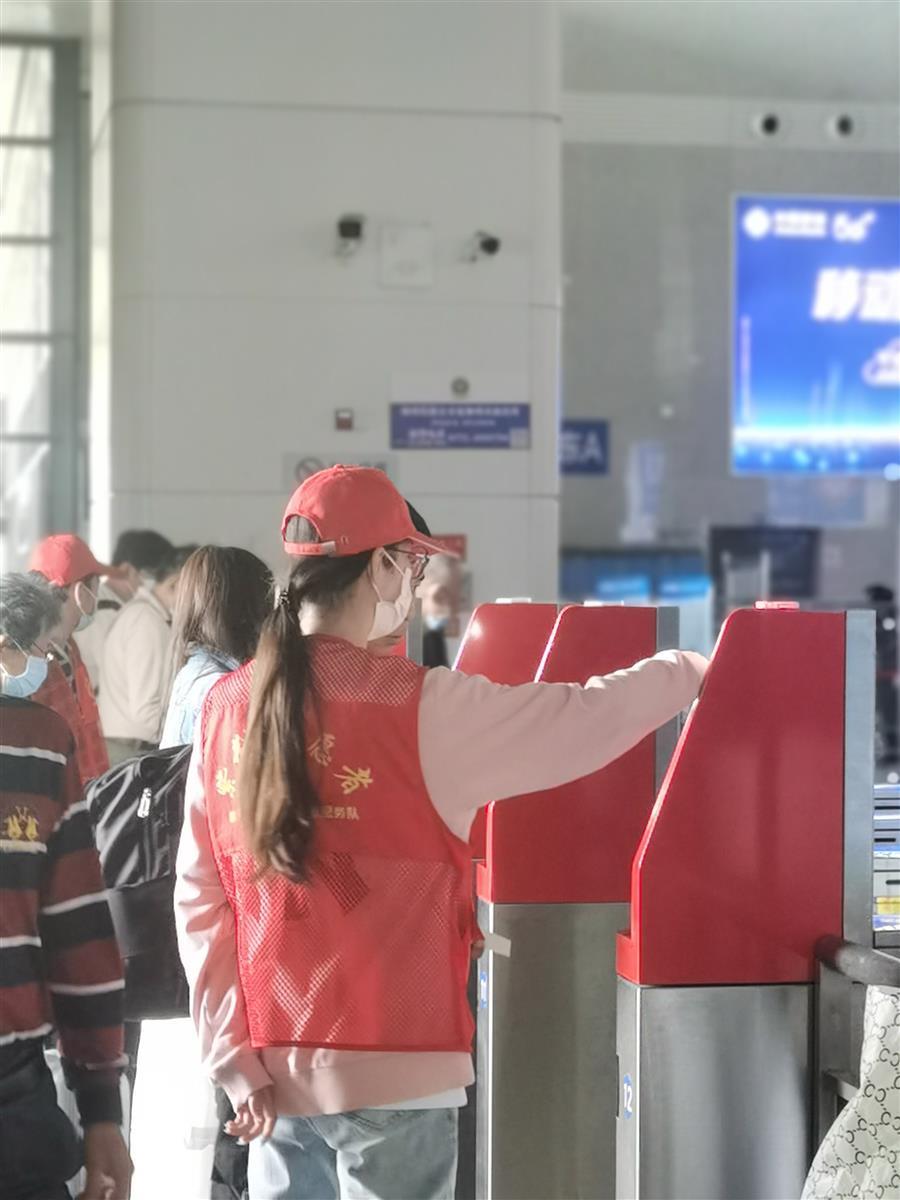 冶建志愿者們?cè)诨疖囌緟f(xié)助車站工作人員做好疫情防控工作,在進(jìn)站口給乘客測(cè)體溫,核實(shí)健康碼、行程碼、核酸證明,引導(dǎo)乘客刷身份證進(jìn)站、為進(jìn)出站的乘客指路。
